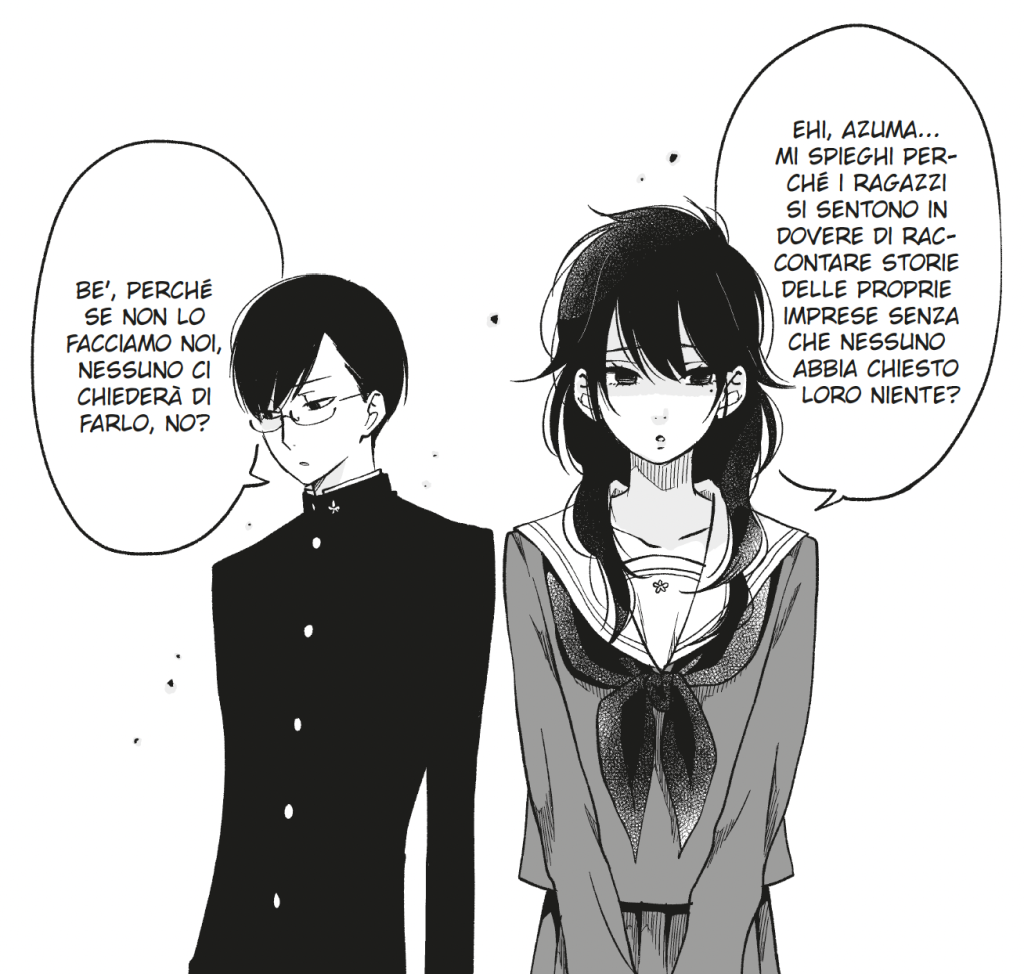 Quando Nozomi gli confessa i suoi sentimenti, la sua prima reazione è rimproverarla. Le ragazze non dovrebbero dichiararsi, dice, perché tolgono ai ragazzi il gusto della conquista. Eppure, nonostante le sue teorie, qualcosa in lui cambia. Conversazione dopo conversazione, Azuma inizia ad abbassare le difese. Scopre che parlare con qualcuno — davvero parlare, senza schermi né filtri — può essere più intimo di qualsiasi contatto fisico.